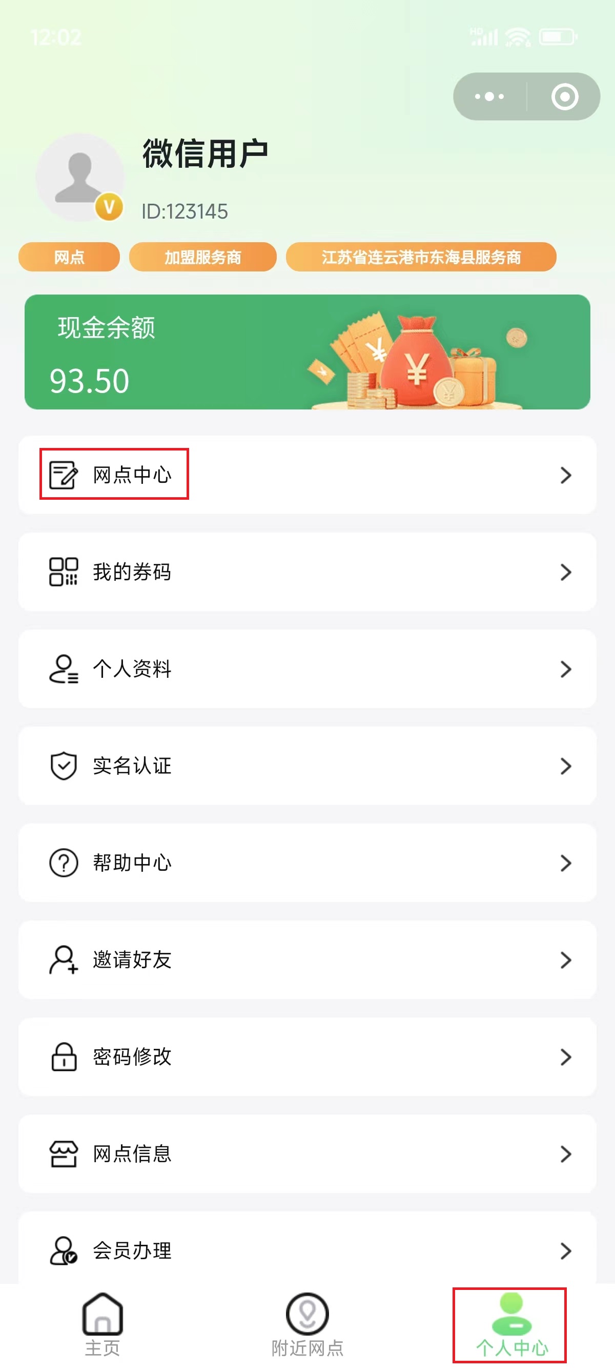 6.商家打开小程序首页,点击右下角个人中心,点击网点中心